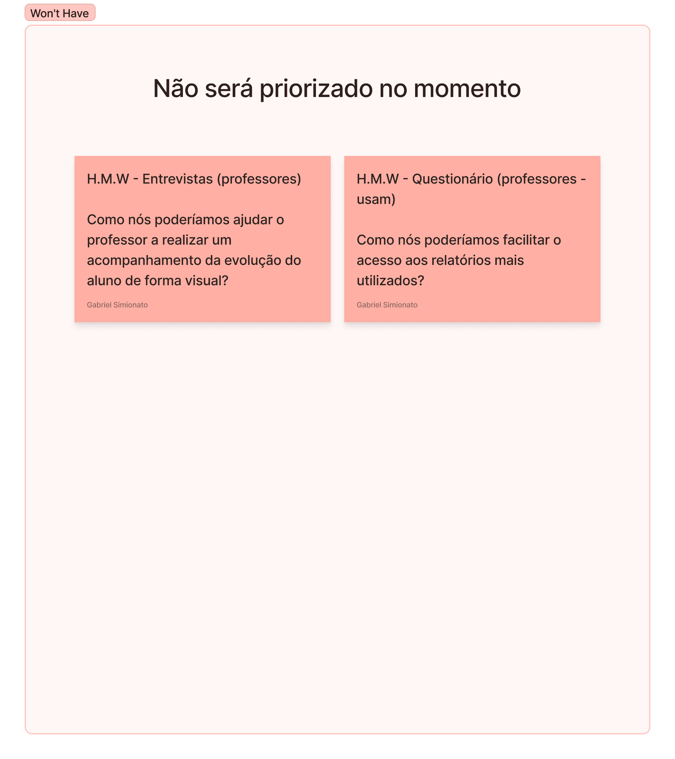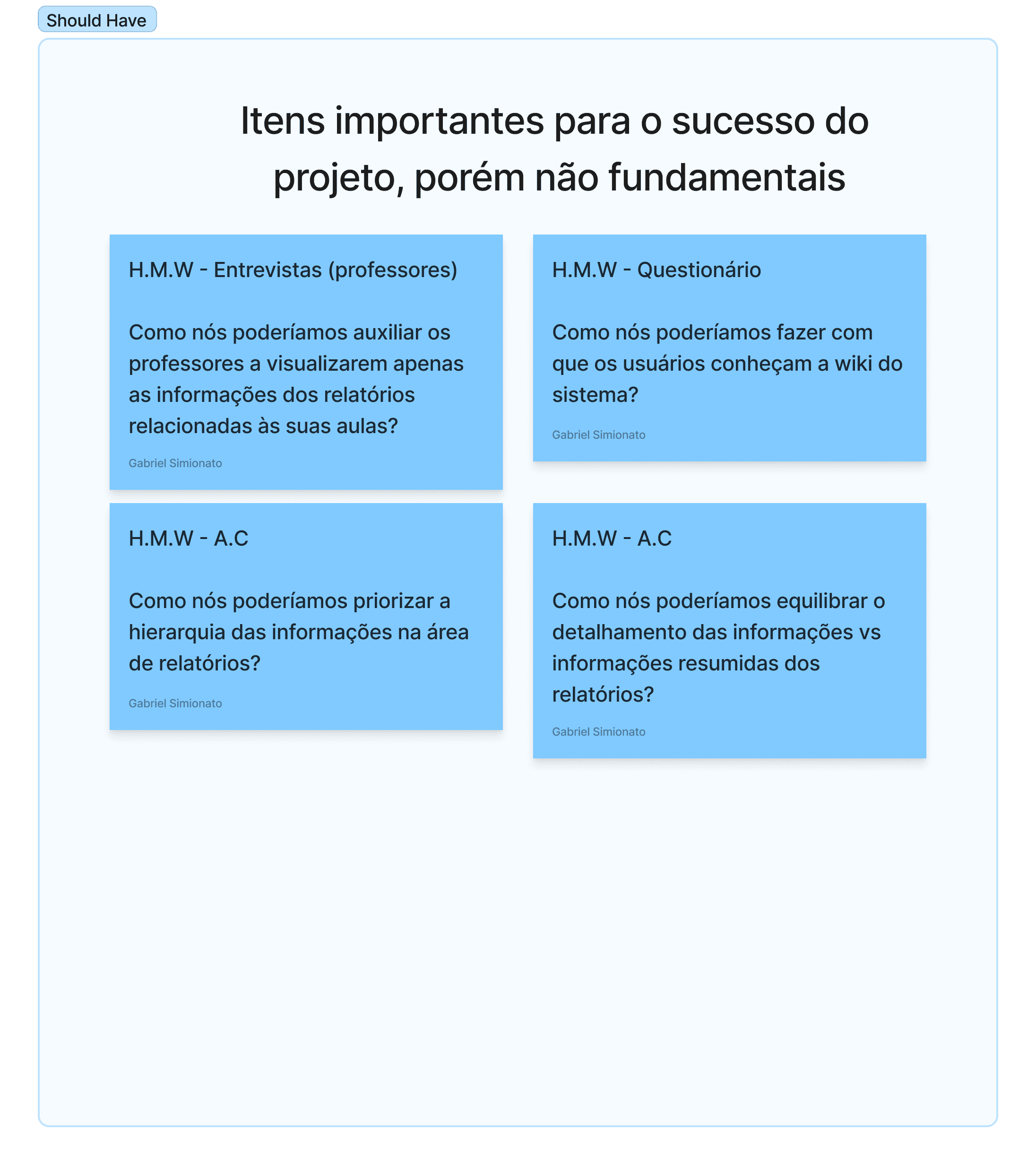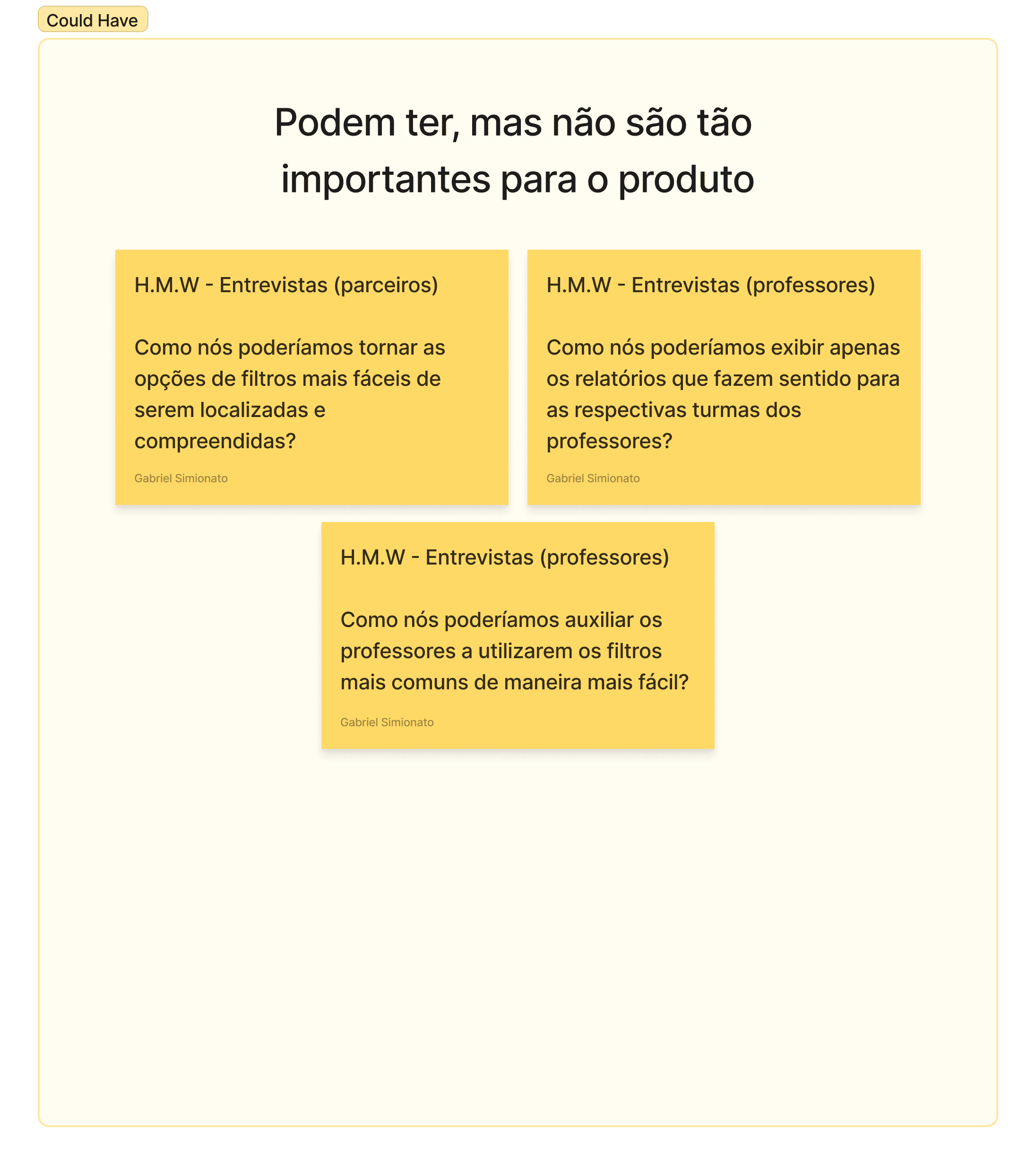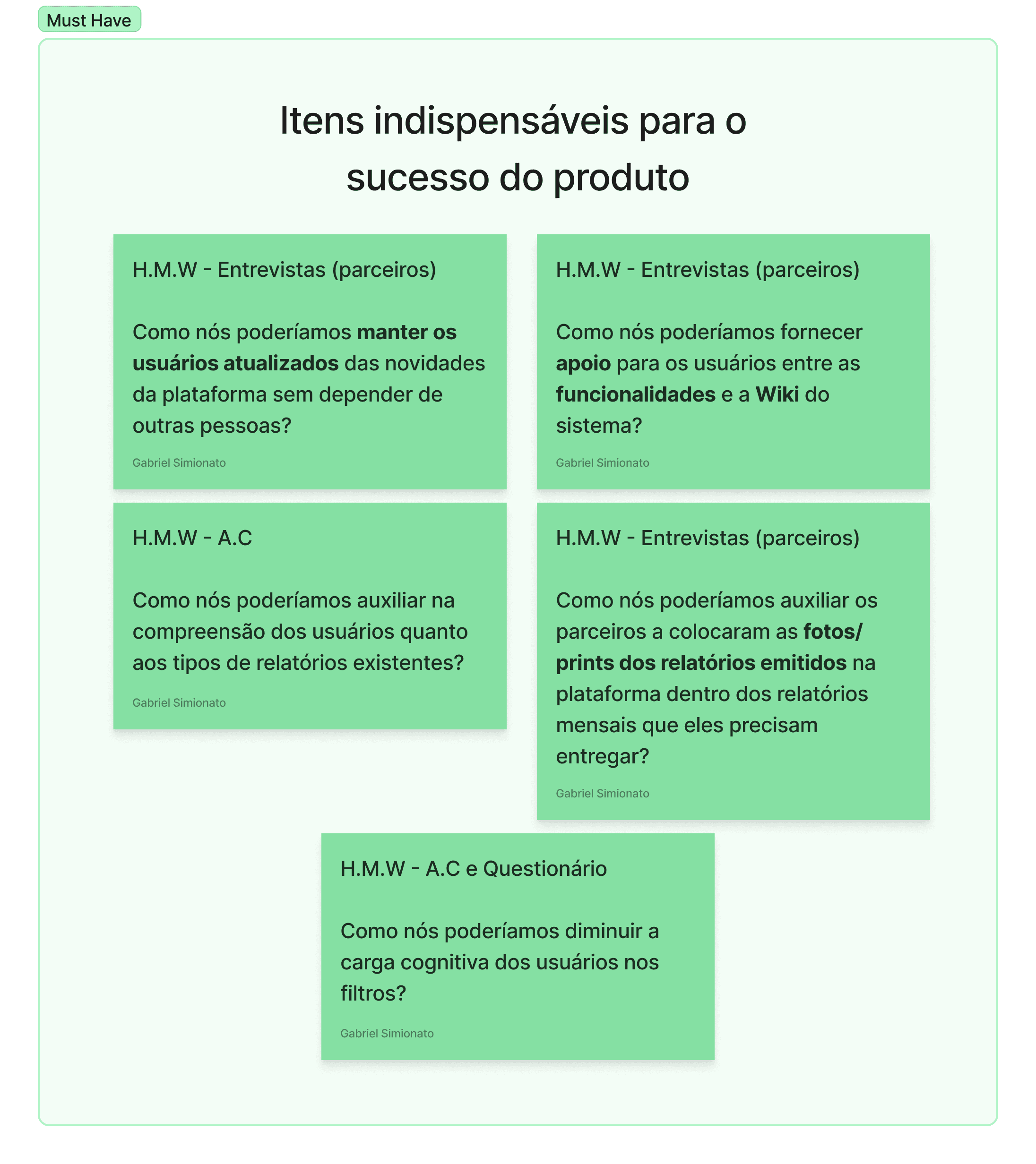 Os problemas identificados foram transformados em questionamentos através da técnica de How Might We. Posteriormente realizei uma dupla priorização com uma matriz de esforço x impacto e posteriormente MoSCoW.