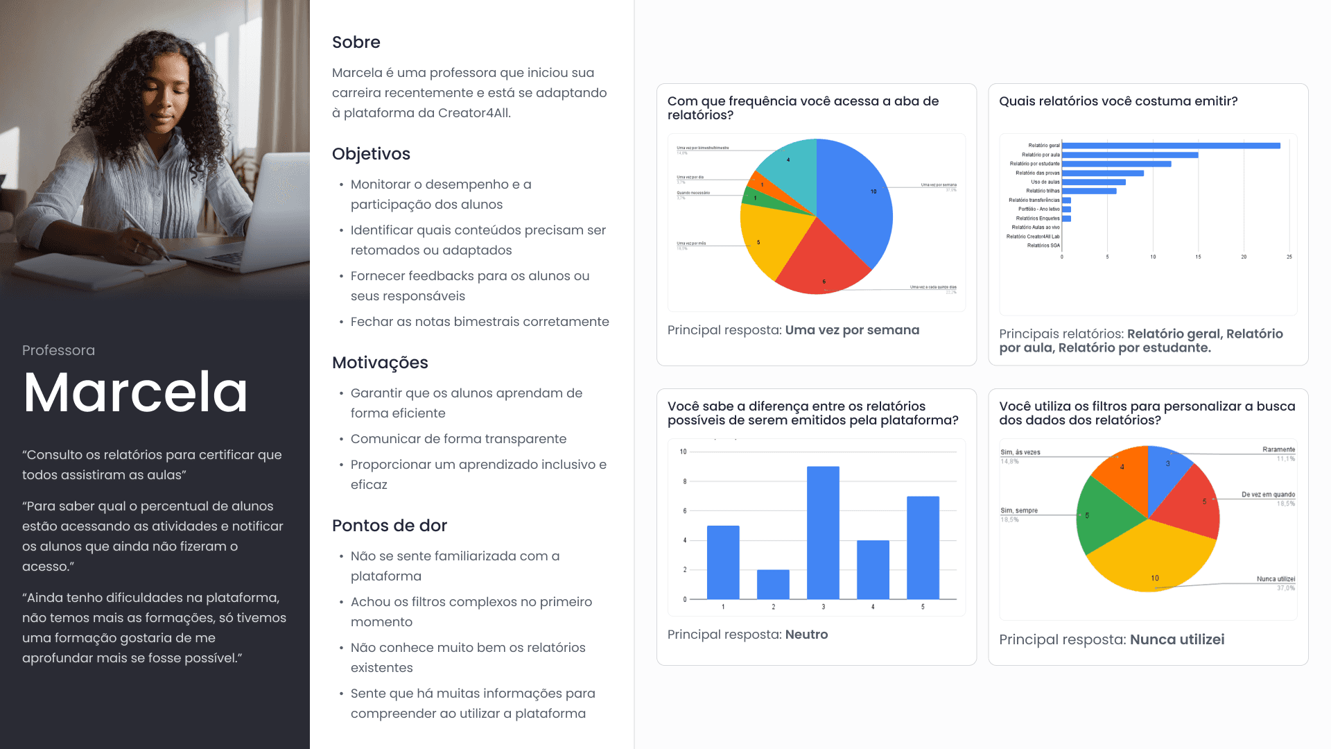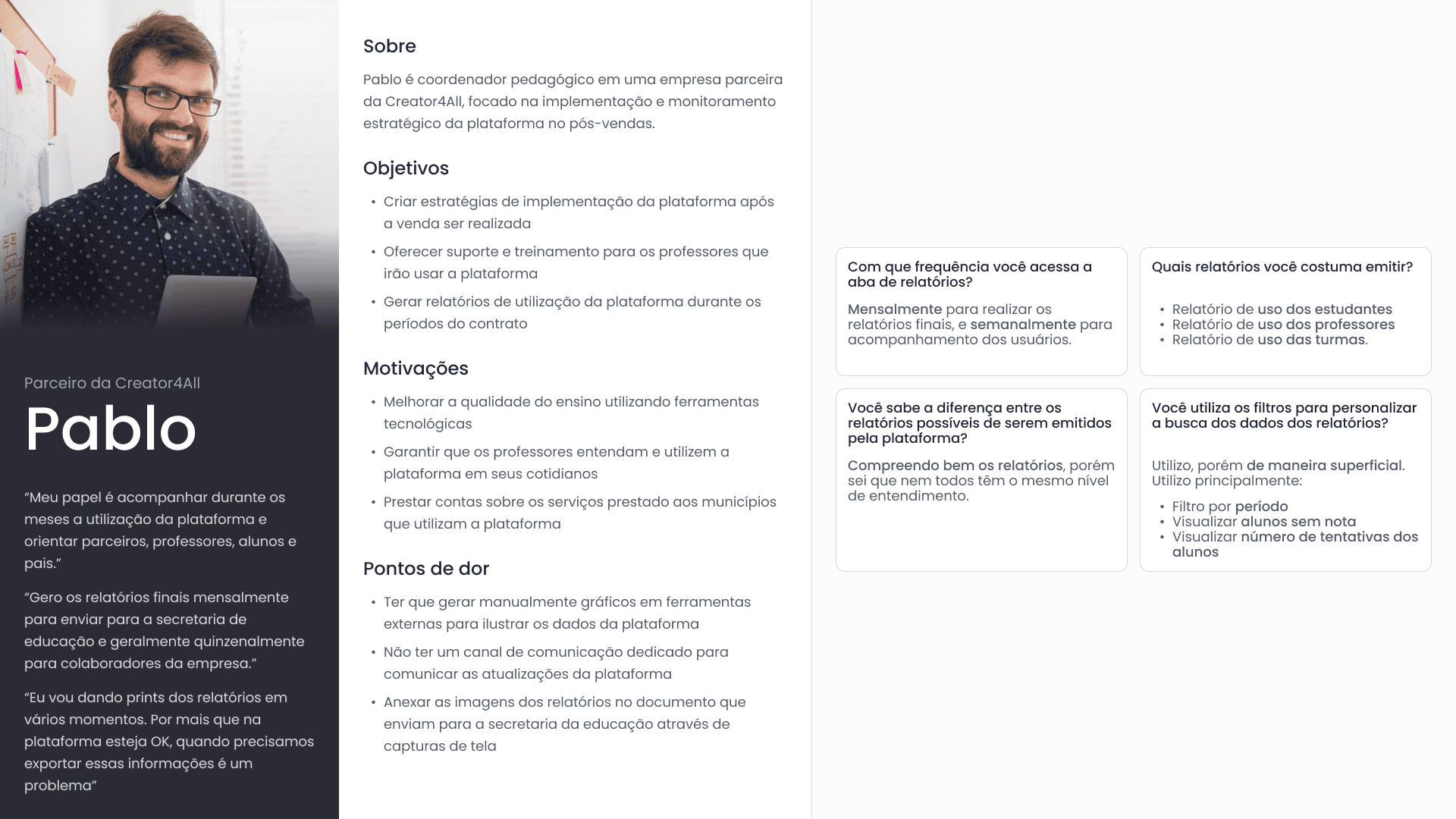 Apliquei um questionário online e obtive 42 respostas — 3 coordenadores pedagógicos e 39 professores. Além disso, entrevistei 4 usuários — 3 parceiros da plataforma e 1 professor.