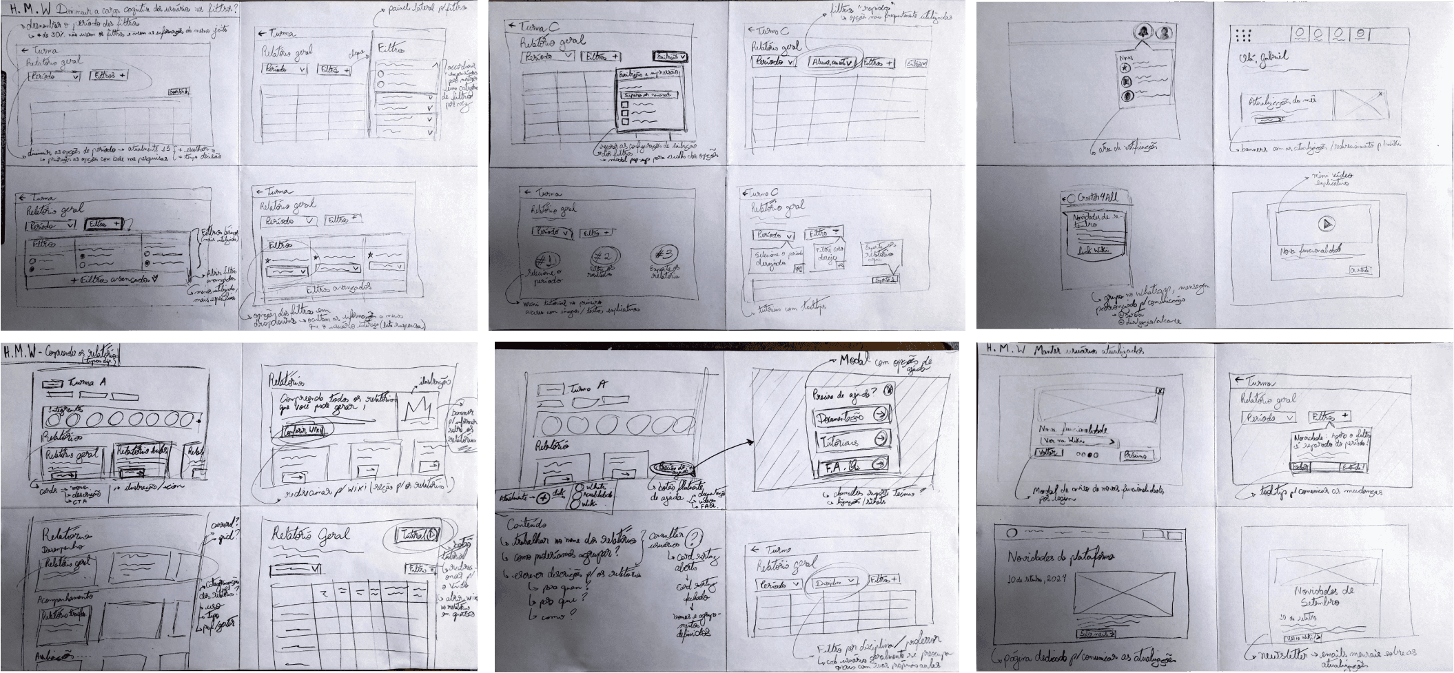 Começando pelo bom e velho lápis e papel, criei wireframes de baixa fidelidade para explorar possibilidades.